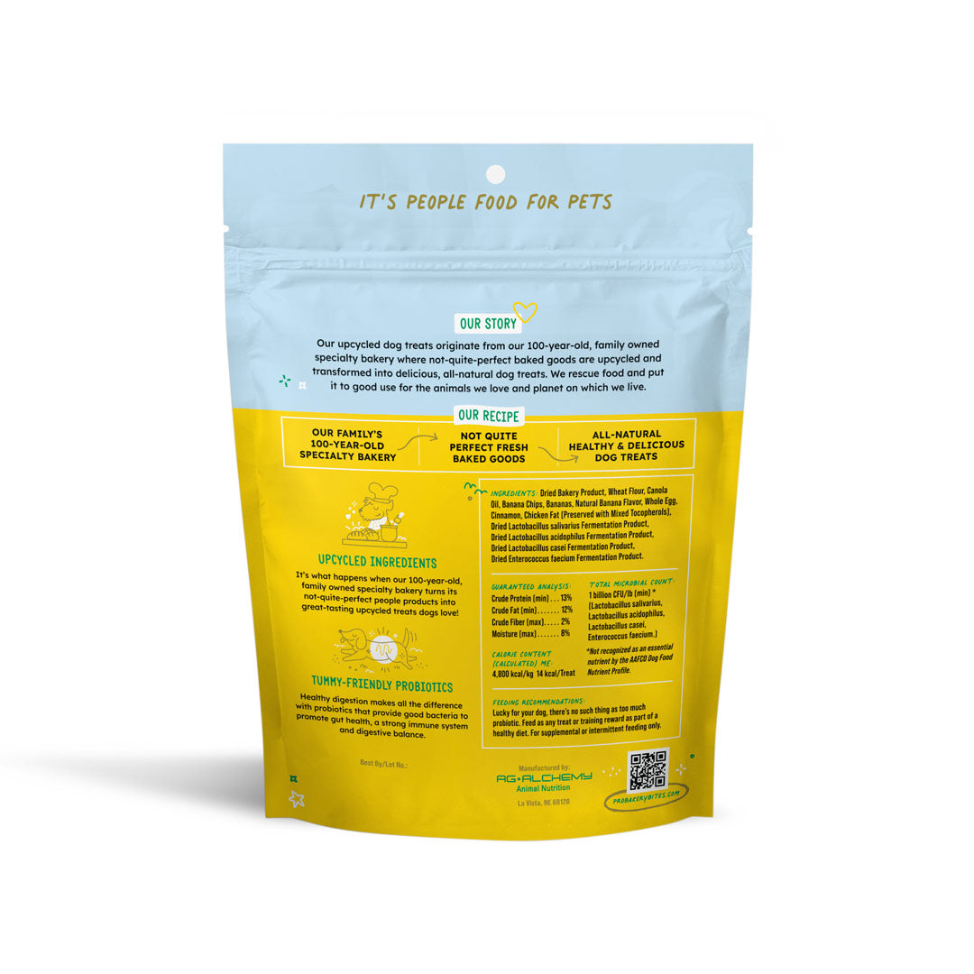 Ingredients: Dried bakery product, wheat flour, canola oil, banana chips, bananas, natural banana flavor, whole egg, cinnamon, chicken fat (preserved with mixed tocopherols), Lactobacillus salvarius Fermentation, Lactobacillus acidophilus Fermentation, Lactobacillus casei Fermentation, Enterococcus faecium Fermentation.