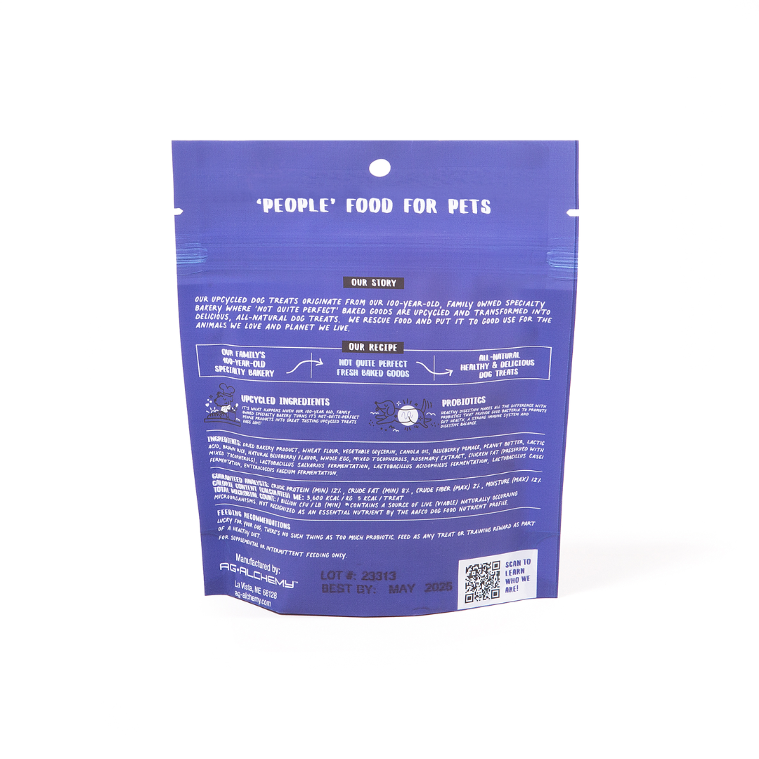 Ingredients: Dried Bakery Product, Wheat Flour, Vegetable Glycerin, Canola Oil, Blueberry Pomace, Peanut Butter, Lactic Acid, Brown Rice, Natural Blueberry Flavor, Whole Egg, Mixed Tocopherols, Rosemary Extract, Chicken Fat (Preserved with Mixed Tocopherols), Lactobacillus salvarius Fermentation, Lactobacillus acidophilus Fermentation, Lactobacillus casei Fermentation, Enterococcus faecium Fermentation.