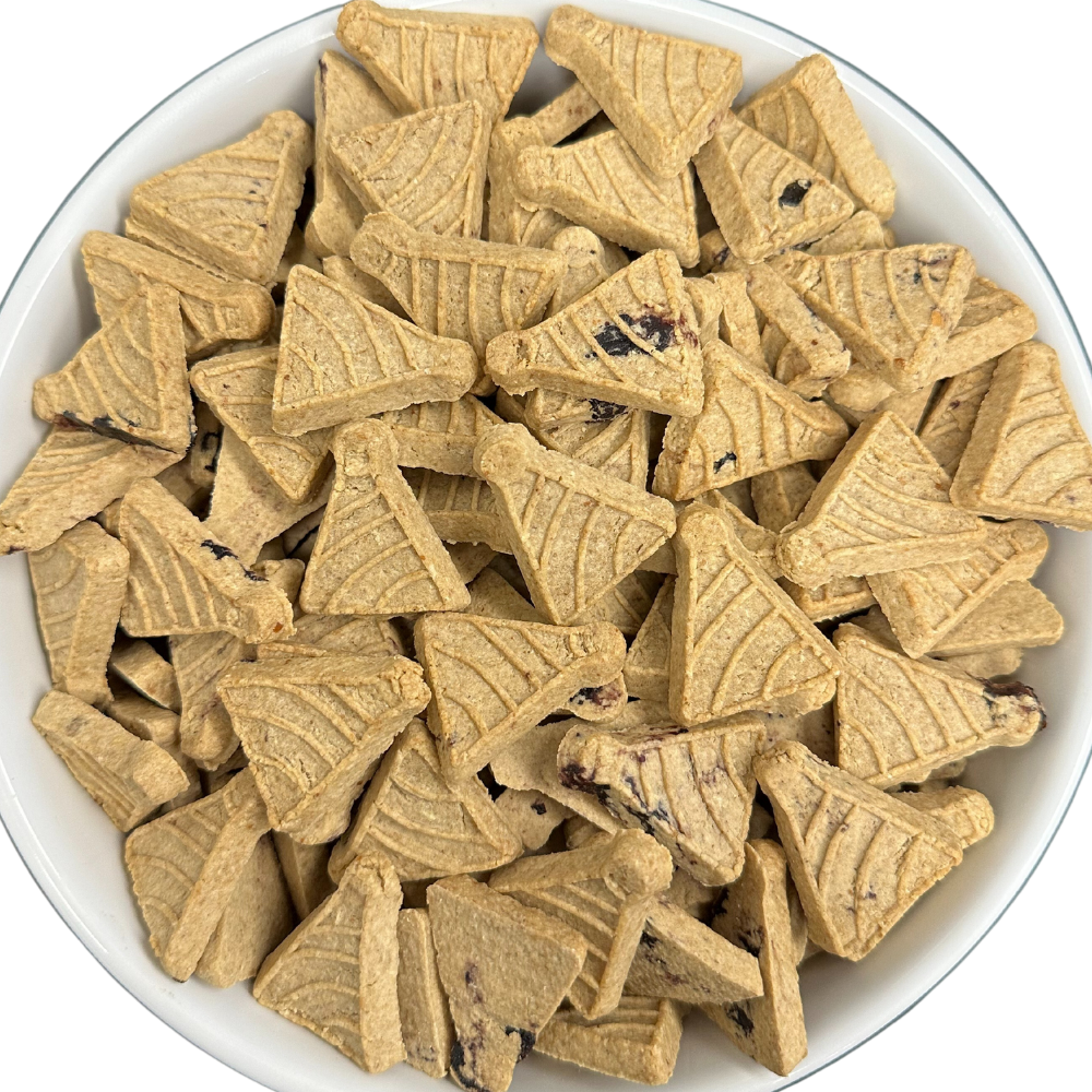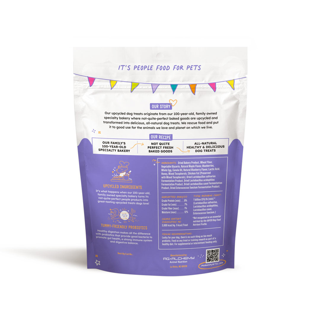 Ingredients: Dried Bakery Product, Wheat Flour, Vegetable Glycerin, Natural Maple Flavor, Blueberries, Whole Egg, Canola Oil, Natural Blueberry Flavor, Lactic Acid, Honey, Mixed Tocopherols, Rosemary Extract, Chicken Fat (Preserved with Mixed Tocopherols), Lactobacillus salvarius Fermentation, Lactobacillus acidophilus Fermentation, Lactobacillus casei Fermentation, Enterococcus faecium Fermentation.